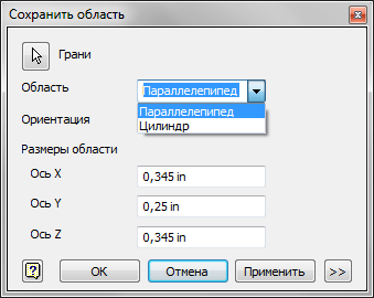 - При необходимости можно развернуть диалоговое окно "Сохранить область" и изменить центральную точку и размеры области. Для цилиндрической области можно также настроить ориентацию. По завершении нажмите кнопку ОК.