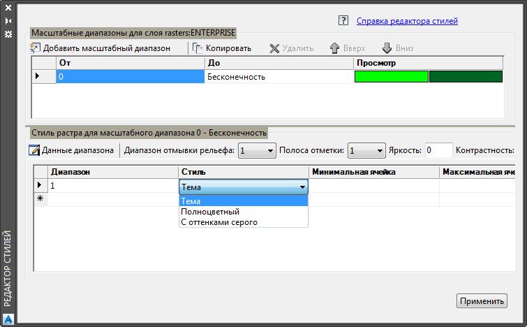 - В "Редакторе стилей" в группе "Стиль растра для масштабного диапазона 0 — Бесконечность" нажмите на стрелку вниз в поле "Стиль". Выберите значение "Тема" (даже если оно уже выбрано).