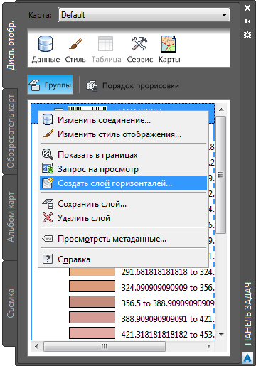 - На вкладке "Диспетчер отображения" щелкните правой кнопкой мыши слой поверхности и выберите "Создать слой горизонталей".