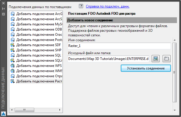 - В окне "Подключение данных" в группе "Подключения к данным по поставщикам" выберите "Добавить растровое изображение или подключение поверхности" и щелкните