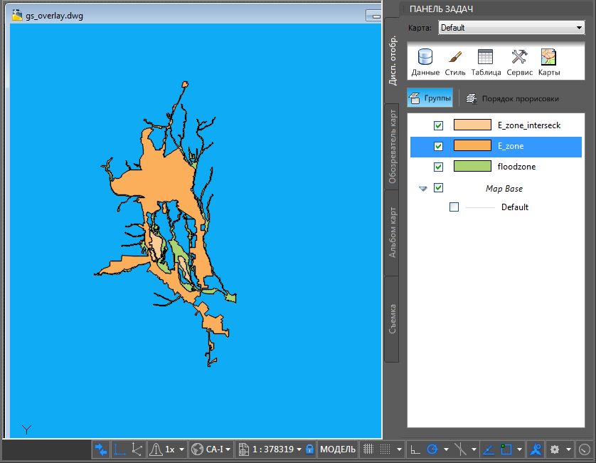На этой карте два слоя накладываются друг на друга (зона затопления и промышленная зона). Путем наложения можно понять, где они пересекаются. Эта область становится новым слоем, для которого можно назначить стиль и сохранить его в виде файла, используемого в качестве отдельного хранилища данных.