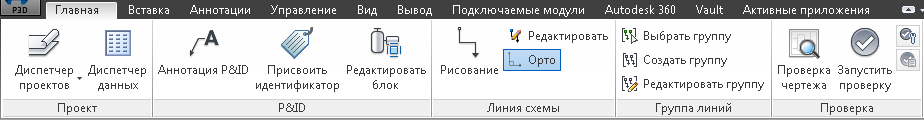На вкладке "P&ID – главная" отображаются параметры для работы с чертежами P&ID. Данная вкладка содержит следующие панели: