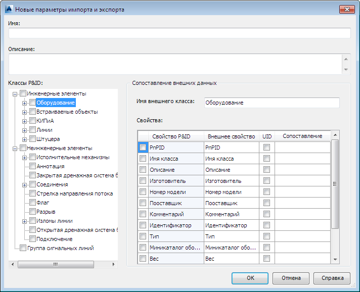 Отображает список свойств, связанных с выбранным классом. Флажки позволяют контролировать, какие свойства будут включены в экспортируемые или импортируемые файлы. Свойство P&ID изменить нельзя. |