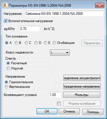Параметры сейсмического расчета конструкции зависят от выбора сейсмических норм, по которым производится расчет влияния сейсмических нагрузок на конструкцию. Выберите сейсмические нормы NS-EN 1998-1:2004/NA:2008 в дилоговом окне Новый вариант или нажмите кнопку Параметры в диалоговом окне Тип расчета.