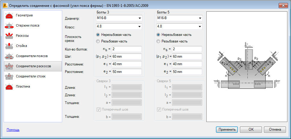 - диаметр и класс болтов, используемых для подсоединения стержня с фасонкой, расположение болтов на стержне и плоскость среза (при выборе болтового соединения);