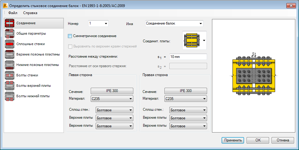 Прим.: Если выбран параметр "Симметричное соединение", список пластин в меню Соединительные плиты содержит только симметричные варианты.