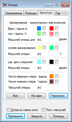 При переходе на вкладку "Армирование" диалоговое окно Эпюры для стержней выглядит так.