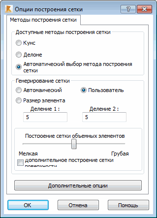 С помощью ползунка можно выбрать тип сетки объемных конечных элементов для создания: "Крупная" или "Мелкая". Если для генерации сетки объемных конечных элементов выбрать параметр "Дополнительное разбиение поверхности", будет также создана сетка на поверхности (контуре) твердого тела. Следует отметить, что при включении этой опции размеры объемных конечных элементов сетки уменьшаются.