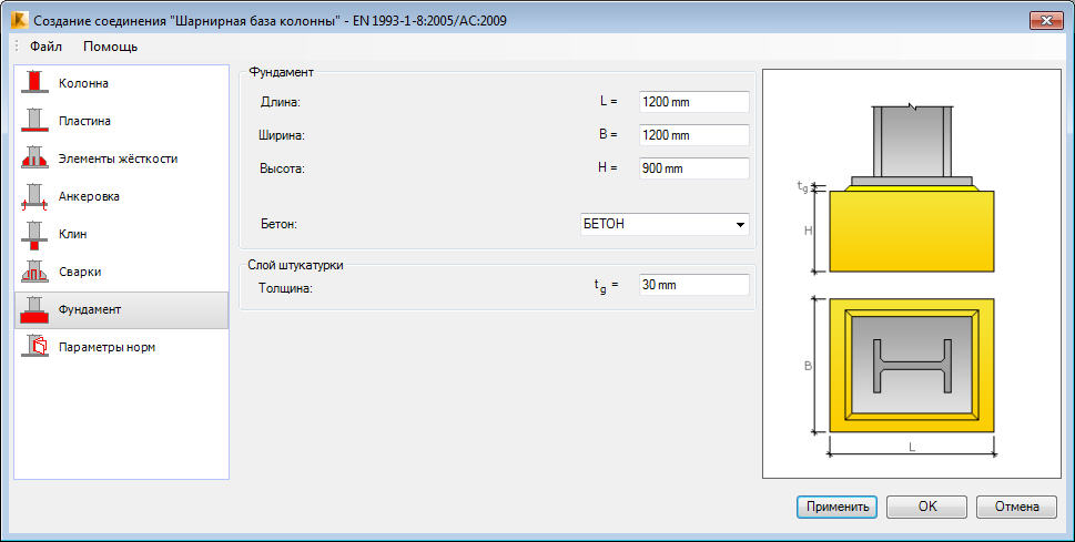 На вкладке "Фундамент" задаются основные параметры фундамента; здесь также можно выбрать класс бетона для фундамента. Эта информация используется для оценки прочности опорной плиты колонны к давлению на бетон. В поле "Слой штукатурки" можно определить параметры слоя штукатурки, который обычно наносится для правильного расположения колонны и обеспечения полного контакта опорной плиты с фундаментом.