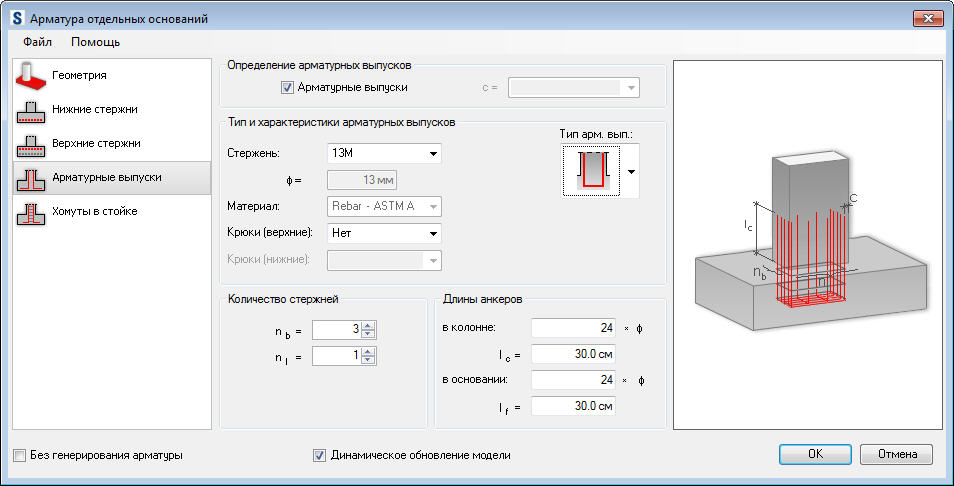 Чтоб создать арматурные выпуски, в поле Определение арматурных выпусков включают опцию Арматурные выпуски. Здесь можно задавать характеристики выпусков: