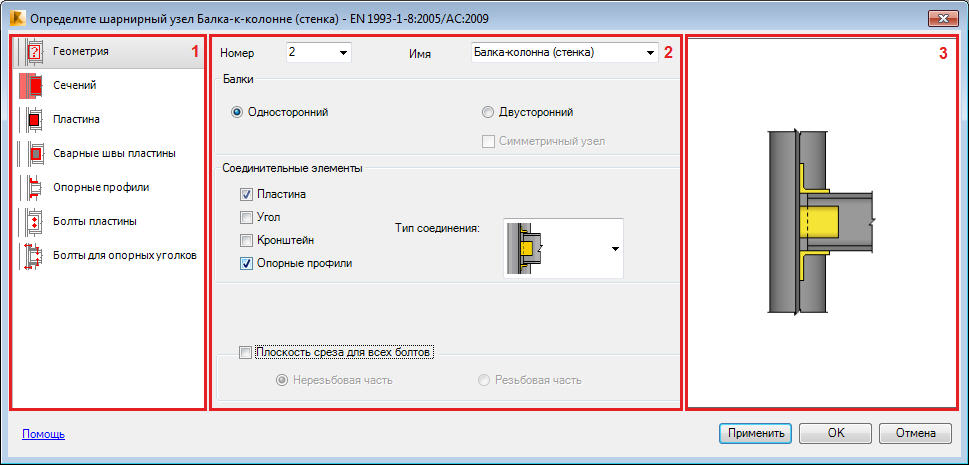 Диалоговое окно для создания шарнирного соединения "балка-колонна" (стенка или полка) содержит 3 основные области: