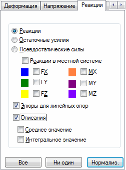 - реакции: реактивные силы – значения реактивных сил в опорах и реактивных моментов - значения моментов в опорах;