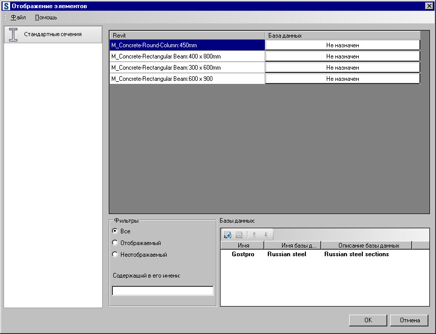 - Диалоговое окно Отображение элементов открывается, только если во время переноса имена сечений (определенные в Revit) не распознаются в активной базе данных сечений в Robot.