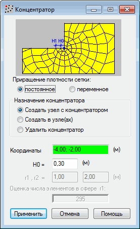 Концентратор может быть задан графически указанием положения концентратора с помощью курсора и последующим заданием параметра H0 или с помощью клавиатуры (для определения параметров концентратора следует нажать кнопку Применить).