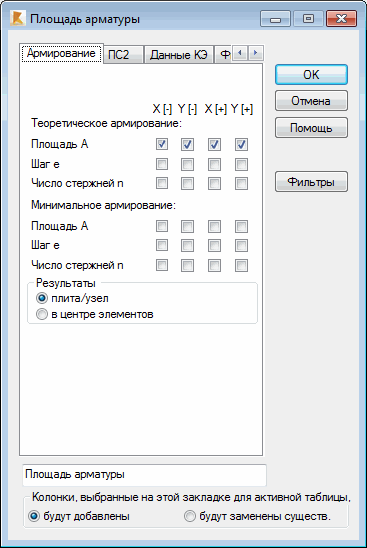 Диалоговое окно Площадь арматуры на вкладке "Армирование" выглядит так.