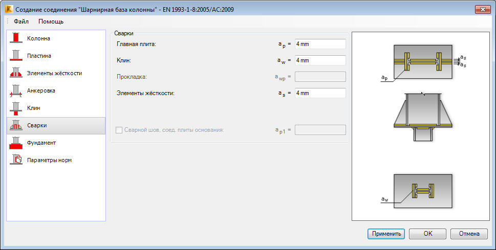 Закладку Сварка используют для того, чтобы определять сварные швы, соединяющие отдельные элементы основания колонны (такие, как основную плиту, клин, прокладку, элементы жесткости).