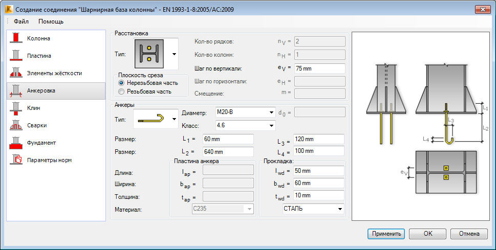 Характеристики анкеров задают в поле Анкеры. Используя опцию Тип, выбирают один из четырех типов анкеров, задают диаметр и материал анкера. Длины отдельных сегментов анкеров указывают в полях L1, L2, L3 и L4. Определяют параметры анкерных пластин и прокладок в полях Пластина анкера и Прокладка.