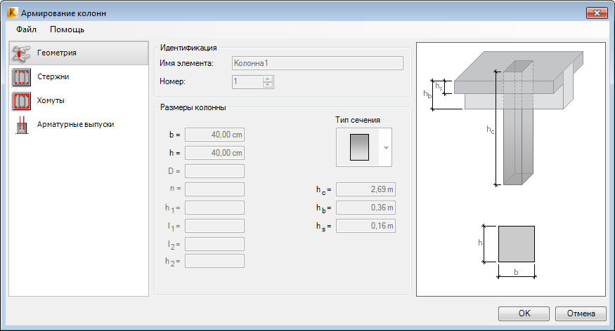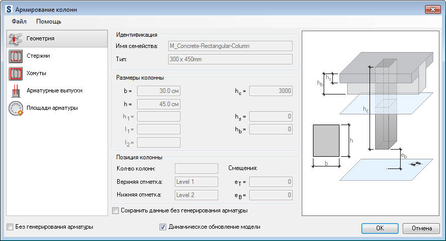 Можно создавать и другие типы поперечного сечения колонн (например, Z-образное, в виде половины окружности и т.д.), но арматура для этих сечений генерироваться не будет.