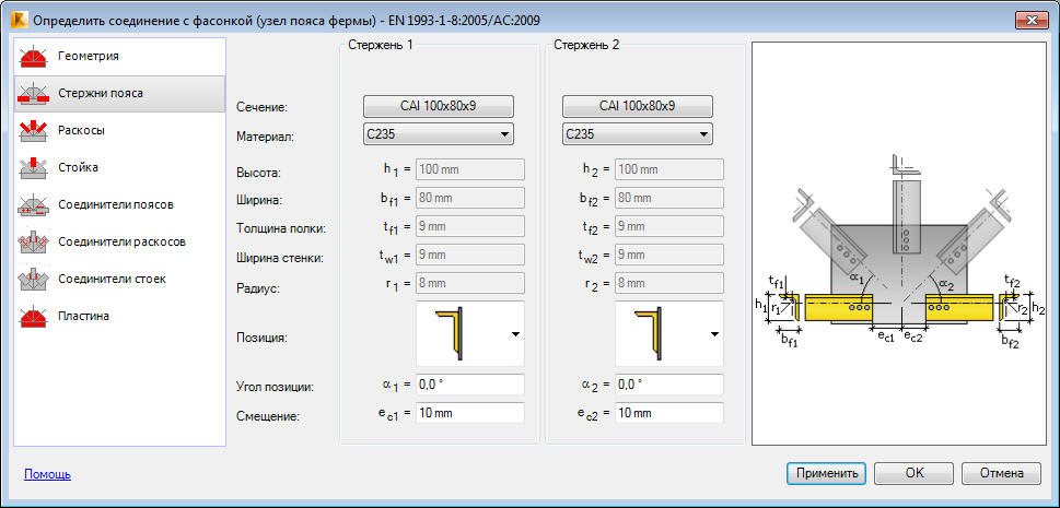 На вкладке "Стержни пояса" можно задать основные параметры стержней пояса, примыкающих к фасонке. Они включают:
