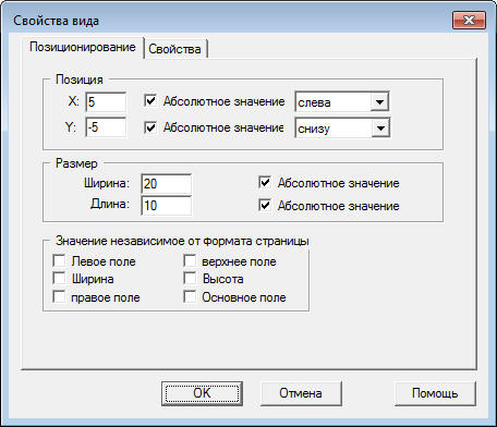Диалоговое окно состоит из одного (Положение - для свойства зон) или двух вкладок (Положение и Свойства). Вкладка Расположение содержит идентичные параметры приведенным в диалоговом окне Свойства текста.
