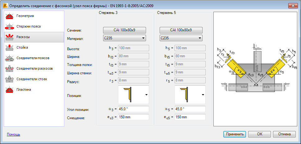 На вкладке "Раскосы" определяются основные параметры раскосов, примыкающих к фасонке. Они включают: