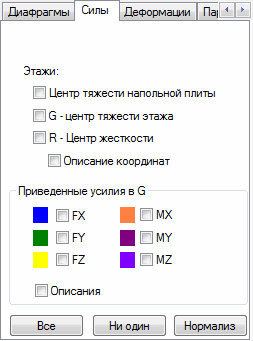 В этом диалоговом окне могут быть выбраны для показа приведенные усилия (Fx, Fy, Fz Mx, My, Mz); эти силы и моменты приведены к центру тяжести каждого этажа для данного случая. Для каждого из значений выше, могут быть выбраны соответствующий цвет и описание (значения сил).