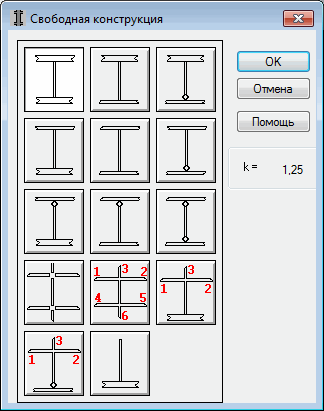 Изображенное ниже диалоговое окно позволяет выбрать модель продольного изгиба для свободных конструкций (для несвободных конструкций открывается аналогичное диалоговое окно). Окно становится активным, если в диалоговом окне Выбор модели продольного изгиба колонны активна опция свободных конструкций (для направления Y или Z) и нажата иконка модели продольного изгиба.