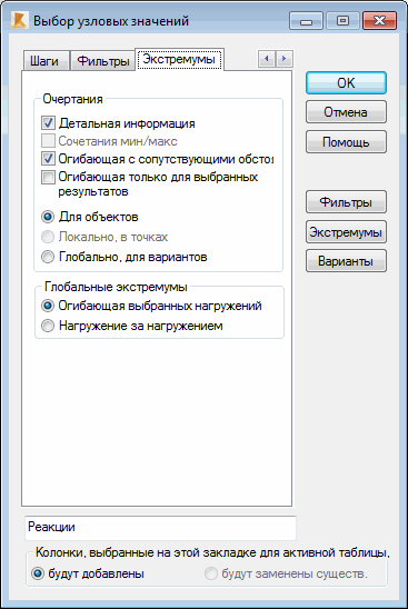 Опции огибающей используются для поиска предельных значений выбранных вариантов нагружения.