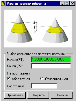 - Определить в указанном выше диалоговом окне координаты сегмента, подлежащего растягиванию. В полях редактирования Начало (P1) и Конец (P2) определить координаты точек, указывающих область объекта, которая растягивается. Эта область расположена между двумя плоскостями, перпендикулярными указанному сегменту, и проходит через начальную точку и конечную точку. За переделами этой области объекты не будут изменяться.