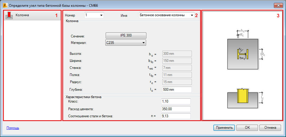 Диалоговое окно для создания соединения "колонна-фундамент" (с основанием бетонной колонны) содержит 3 основные области: