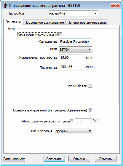 Также могут быть определены Внешние условия и активизирована опция Контроль армирования (EC2 4.4.2.3), которая позволяет контролировать трещинообразование.