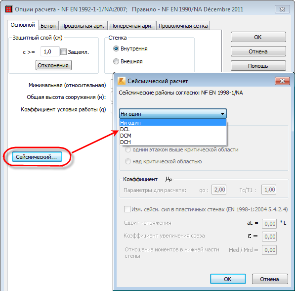 Эти параметры доступны в диалоговом окне "Параметры расчета" для французских норм.