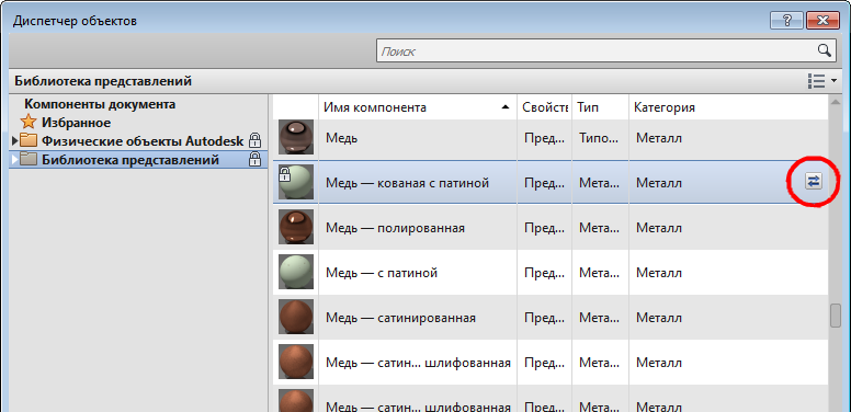 Выбранный набор характеристик заменит исходный в материале и отобразится на панели "Редактор материалов". Повторите эту процедуру для замены других наборов характеристик.