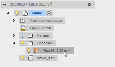 - Тела с оболочками отображаются в узле обозревателя "Оболочка" вместе с информацией о толщине тела: