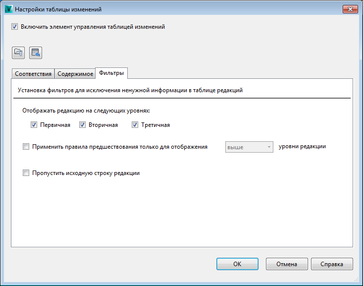 Диалоговое окно "Настройки таблицы редакций" (полный вид)