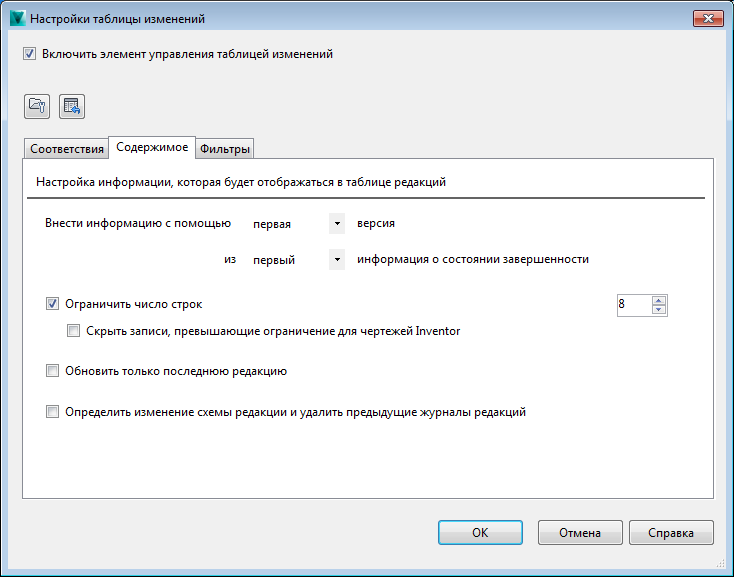 Если требуется ограничить число строк, отображаемых в таблице редакций, установите флажок "Ограничить число строк". Укажите ограничение числа строк, которые должны отображаться, выбрав значение с помощью счетчика. Прим.: Если параметр "Ограничить число строк" включен, избыточные записи удаляются по умолчанию. В чертежах Inventor можно также скрыть эти избыточные записи, не удаляя их.