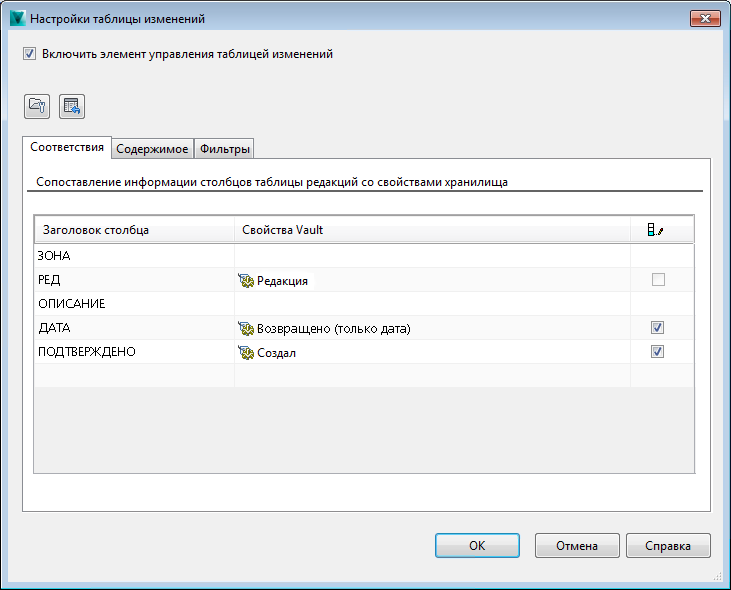 На вкладке "Сопоставления" можно сопоставить свойства Vault со столбцами таблицы редакций. ![]() |