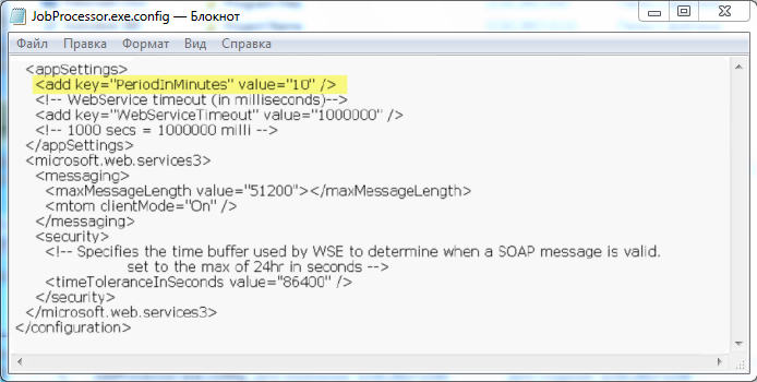 - В строке <add key="PeriodInMinutes value="10"/> укажите требуемое значение. Период можно задать дробным значением, например 0,1 для 6 секунд или 1,5 для 90 секунд.