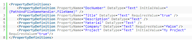 Прим.: В файле CFG необходимо настроить все поля, которые будут доступны в качестве свойств в диалоговом окне Data Standard. Имя свойства также является именем файла или свойства основной надписи. Если имя свойства совпадает с существующим свойством файла, например