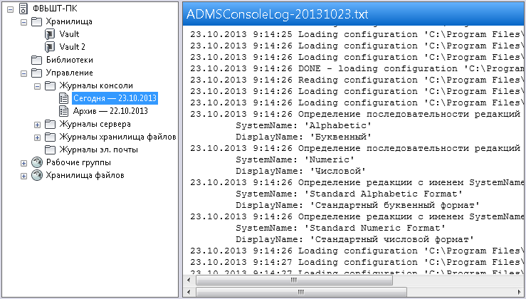 В консоли ADMS можно просматривать журналы консоли, сервера, хранилища файлов и электронной почты.