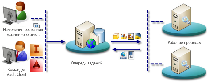 - Job Processor — отдельное приложение, которое резервирует отложенные задания и удаляет их с сервера очереди для обработки. Так как Job Processor устанавливается вместе с клиентом хранилища, для публикации заданий может использоваться любой компьютер с Autodesk Vault Workgroup и Autodesk Vault Professional.