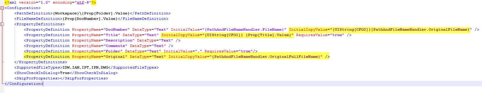 Эти значения можно настроить с помощью дополнительного атрибута InitialCopyValue для элемента <PropertyDefinition> в файле Inventor.cfg.