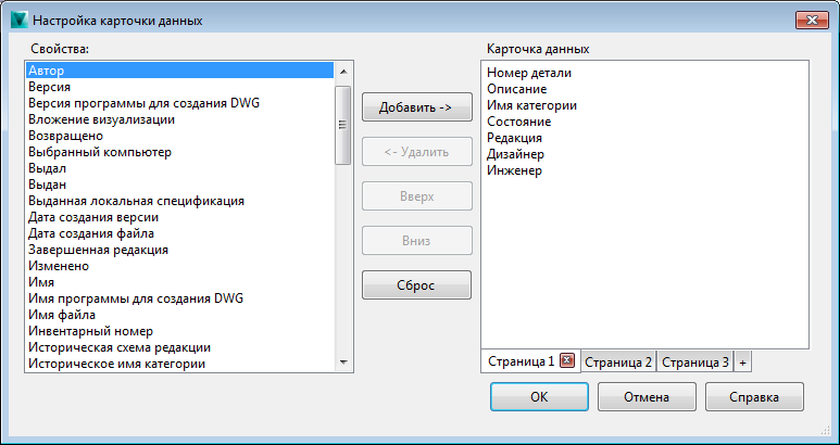 Администратор может осуществлять управление вкладками и определять свойства, которые пользователь САПР может изменять в диалоговом окне "Настройка карточки данных". Список свойств содержит все свойства, которые можно добавить на выбранную вкладку. Свойство добавляется на вкладку только один раз. При этом одно и то же свойство может присутствовать на различных вкладках.