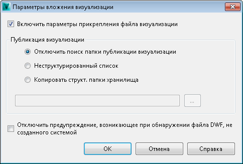 В диалоговом окне "Параметры вложения визуализации" можно включить или отключить вложения файла, указать место публикации вложения визуализации, а также включить или отключить предупреждения DWF.