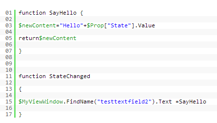 После захвата события вызывается функция StateChanged. Свойство State связано с текстовым полем (testtextfield). Теперь каждый раз при вставке пользователем нового текста в это поле выполняется вызов функции StateChanged. Другая простая функция (SayHello) может быть использована для записи результата ("Hello" + введенная строка) в другом поле (testtextfield2). Эти две функции можно записать следующим образом: