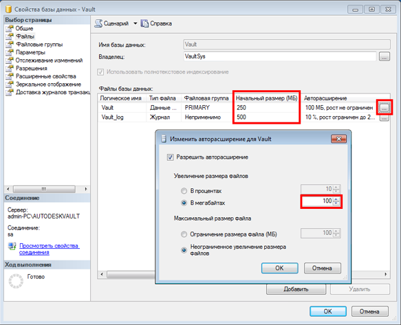 - Задайте для параметра "Авторасширение" значение "100 МБ" и неограниченное увеличение для каждого файла данных.