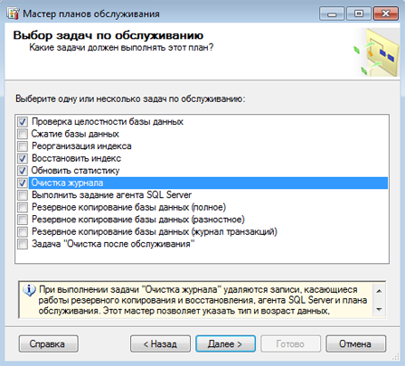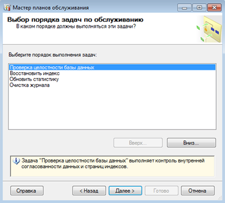Планы обслуживания можно использовать для планирования задач, которые требуется выполнить, чтобы проверить правильность работы базы данных, например поддержание небольшого размера базы данных и файл журнала транзакций и проверка базы данных на наличие несоответствий.