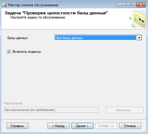 - В диалоговом окне "Определение задачи проверки целостности базы данных" выберите все пользовательские базы данных из раскрывающегося списка и установите флажок "Включить индексы".