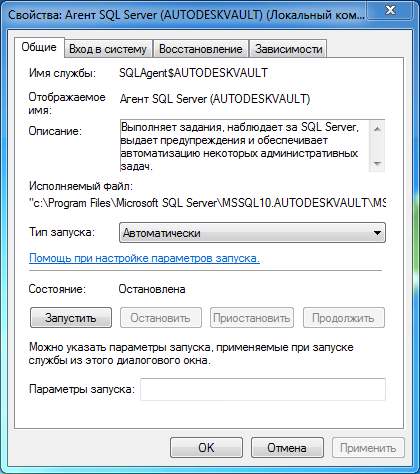 - Найдите службу агента SQL-сервера (AUTODESKVAULT).