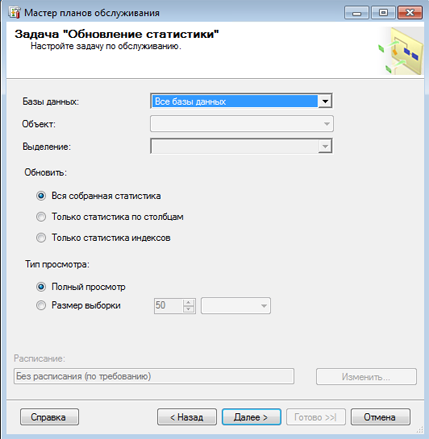 - В диалоговом окне "Определение задачи обновления статистики" выберите следующие параметры.